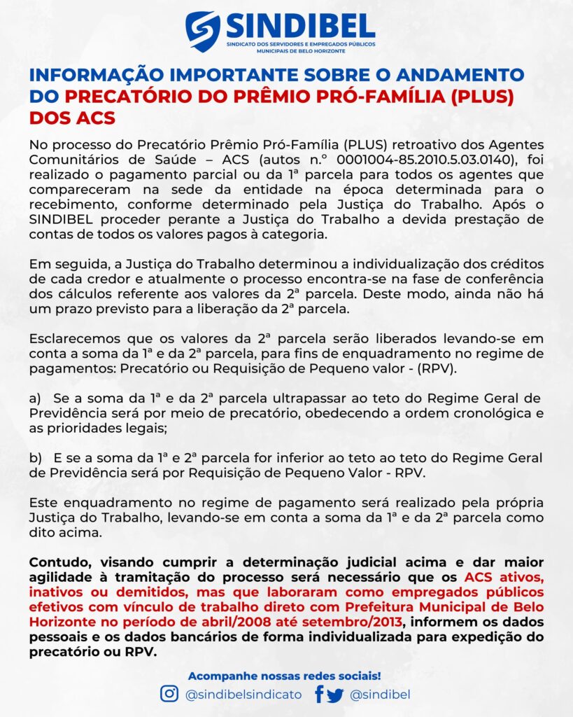 🔵 SINDIBEL INFORMA – INFORMAÇÃO IMPORTANTE SOBRE O ANDAMENTO DO PRECATÓRIO DO PRÊMIO PRÓ-FAMÍLIA (PLUS) DOS ACS