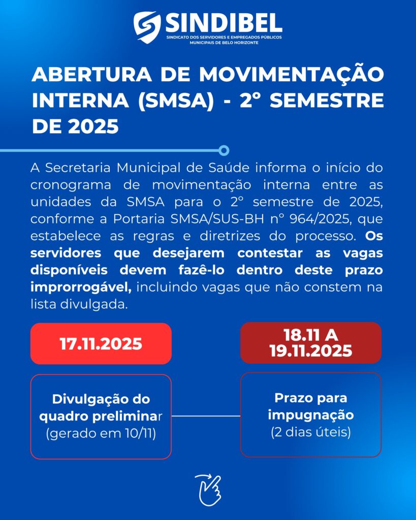 A Secretaria Municipal de Saúde informa o início do cronograma do processo de movimentação interna entre as unidades da SMSA para o 2º semestre de 2025, conforme a Portaria SMSA/SUS-BH nº 964/2025, que estabelece as regras e diretrizes para a movimentação dos profissionais.